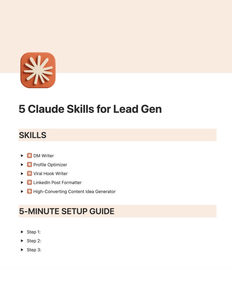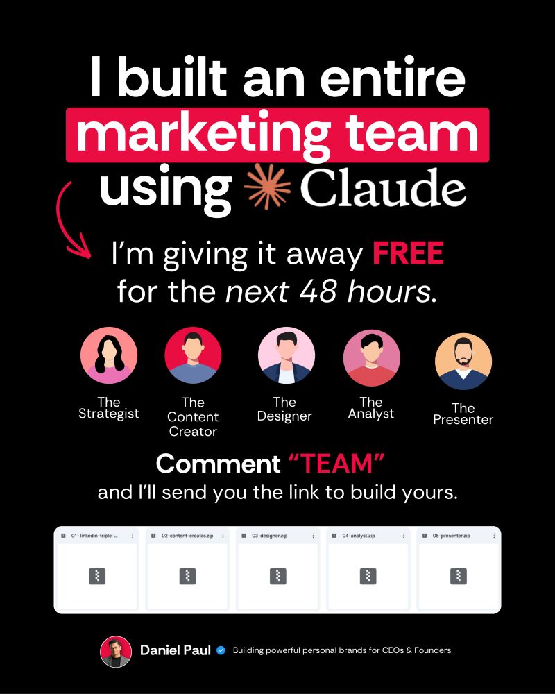 AI turned my LinkedIn into a lead-gen machine. I'm giving away 5 Claude Skills that'll do the heavy lifting for you. Full kit: https://lnkd.in/gyiDAMFS I've used this AI marketing team for over a year as custom GPTs. I recently turned them intoย Ski...